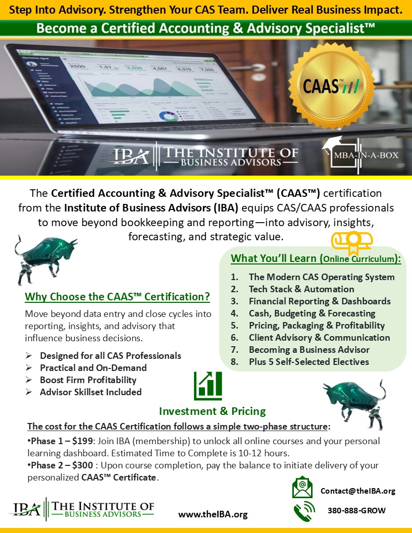 The Certified Accounting & Advisory Specialist™ (CAAS™) certification from the Institute of Business Advisors (IBA) equips Client Accounting & Advisory Services (CAS/CAAS) professionals to deliver insight, speed, and strategic value. If you manage monthly close, reporting, or outsourced accounting — and want to level up into pricing, forecasting, dashboards, and advisory — CAAS gives you the playbooks, tools, and confidence to lead with impact.