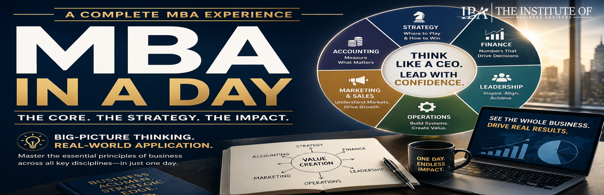 The “MBA-in-a-Day” is an IBA exclusive training course designed to provide you with the knowledge, tools, and strategic insights typically acquired through years of pursuing an MBA degree. This course is carefully curated to empower participants with the essentials of business strategy, leadership, finance, sales & marketing, and incorporates popular business case studies to illustrate practical application. This course will help you elevate your business acumen, enhance your decision-making skills, and gain a competitive edge in the business world. This course is estimated to take 2 hours to complete, and includes a 15 question multiple-choice quiz.